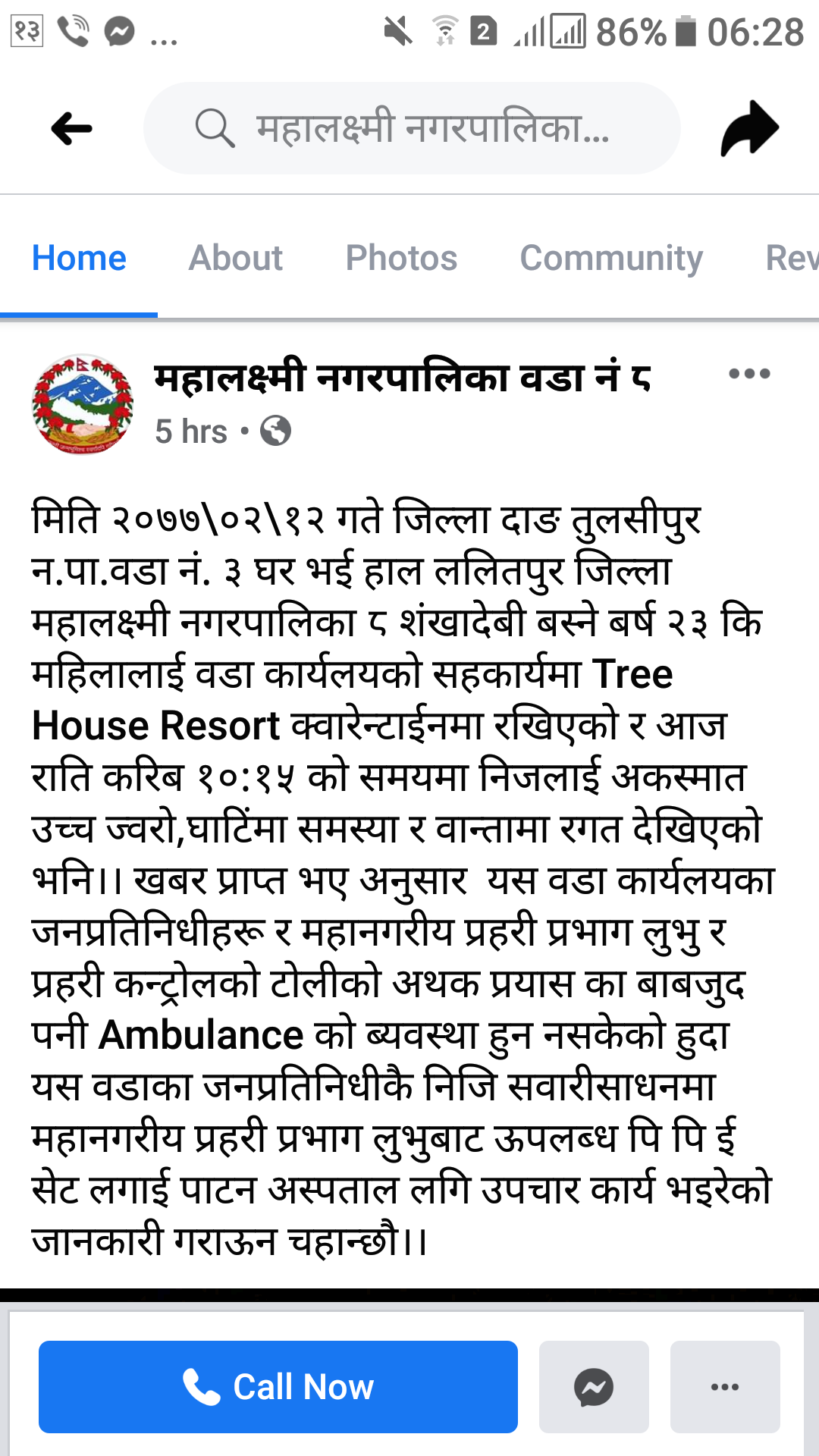 महालक्ष्मी नगरपालिकाका अनुसार अथक प्रयासका बाबजुद पनि एम्बुलेन्सको व्यवस्था हुन नसकेपछि निजी सवारीसाधनमा पिपिई सेट लगाई पाटन अस्पतालमा महिलालाई उपचारका लागि लगिएको थियो । दाङ घर भई शंखादेवीमा बस्ने २३ वर्षीया महिला गत हप्तामात्र काठमाडौं प्रवेश गरेकी थिइन् । उनी काठमाडौं उपत्यका प्रवेशमा कडा पारिएको अवस्थाबीच उनी गाउँटोलमा फर्किएपछि त्रास मच्चिएको थियो ।